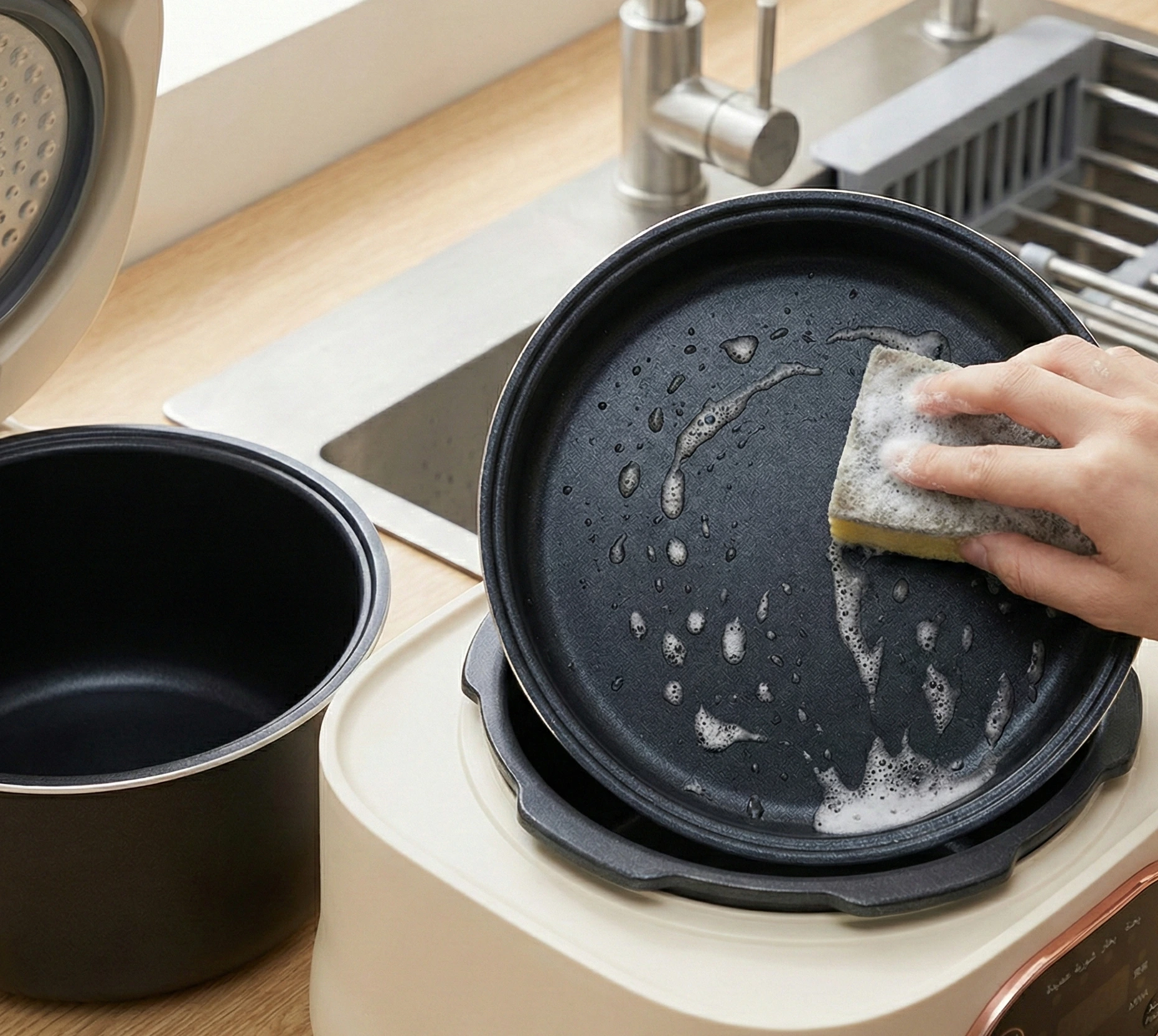 تنظيف في ثوانٍ: أوعية داخلية صحية بطلاء غير لاصق، تضمن لك طهياً بزيت قليل جداً وتنظيفاً فائق السهولة لا يحتاج مجهوداً.