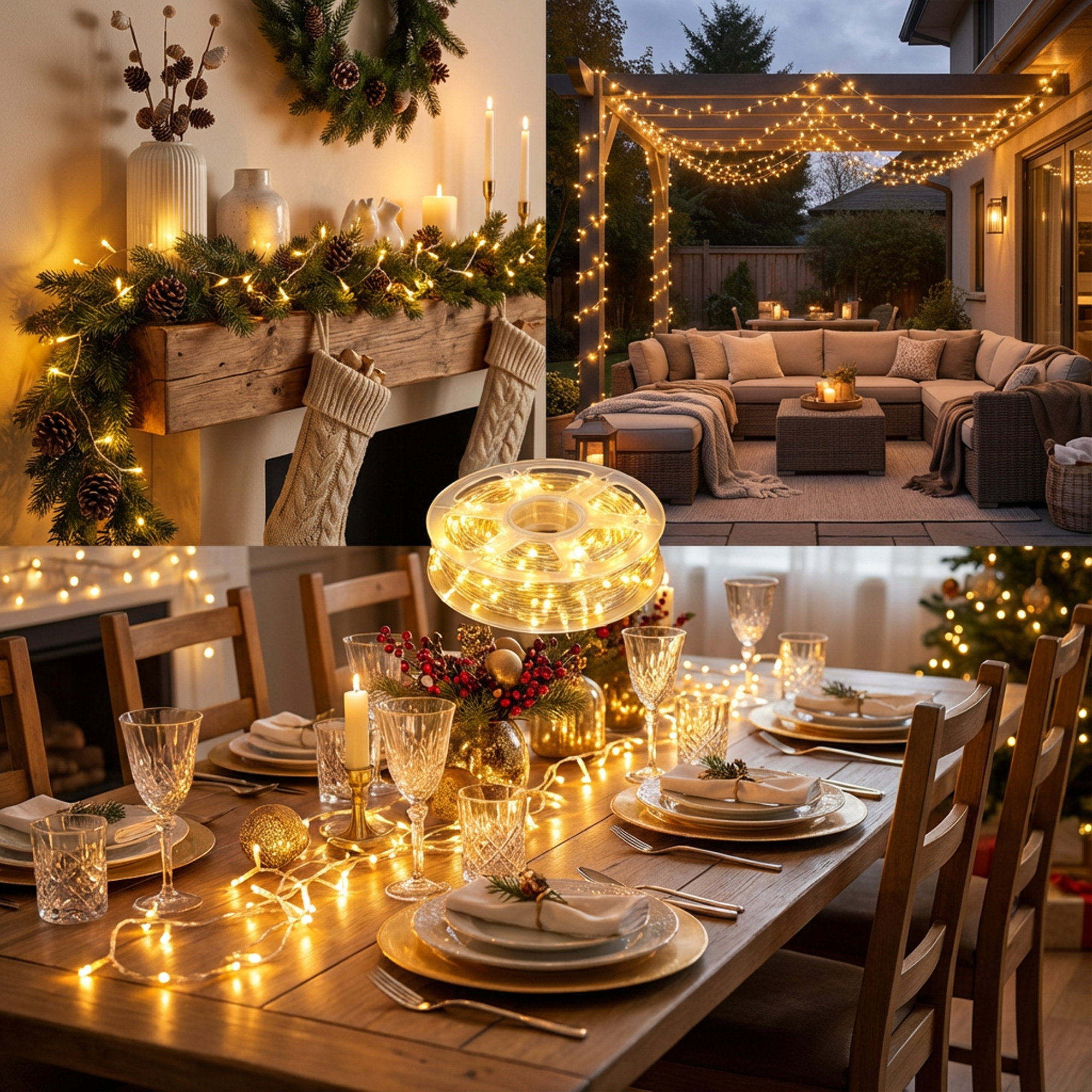 طول أسطوري (100 متر): تغطي واجهة البيت، الحديقة، والأسوار بلفة واحدة فقط! مسافة 20 سم بين المصابيح تضمن توزيعاً ملكياً للنور.